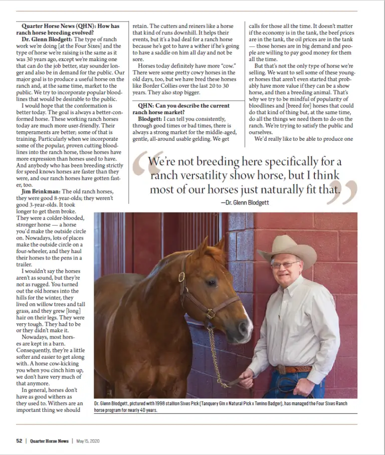 Dr. Glenn Blodgett: The type of ranch work we’re doing [at the Four Sixes] and the type of horse we’re raising is the same as it was 30 years ago, except we’re making one that can do the job better, stay sounder longer and also be in demand for the public. Our major goal is to produce a useful horse on the ranch and, at the same time, market to the public. We try to incorporate popular bloodlines that would be desirable to the public.