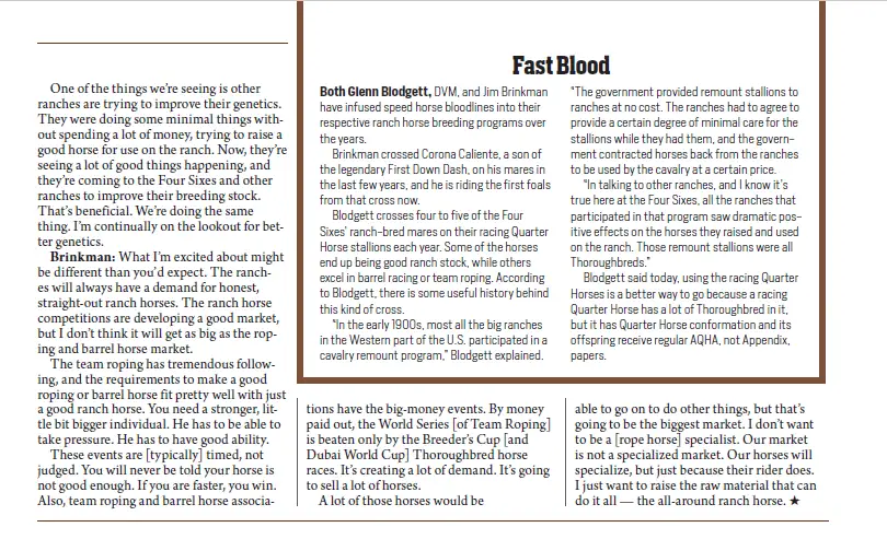 Glenn Blodgett, DVM, and Jim Brinkman have infused speed horse bloodlines into their respective ranch horse breeding programs over the years.