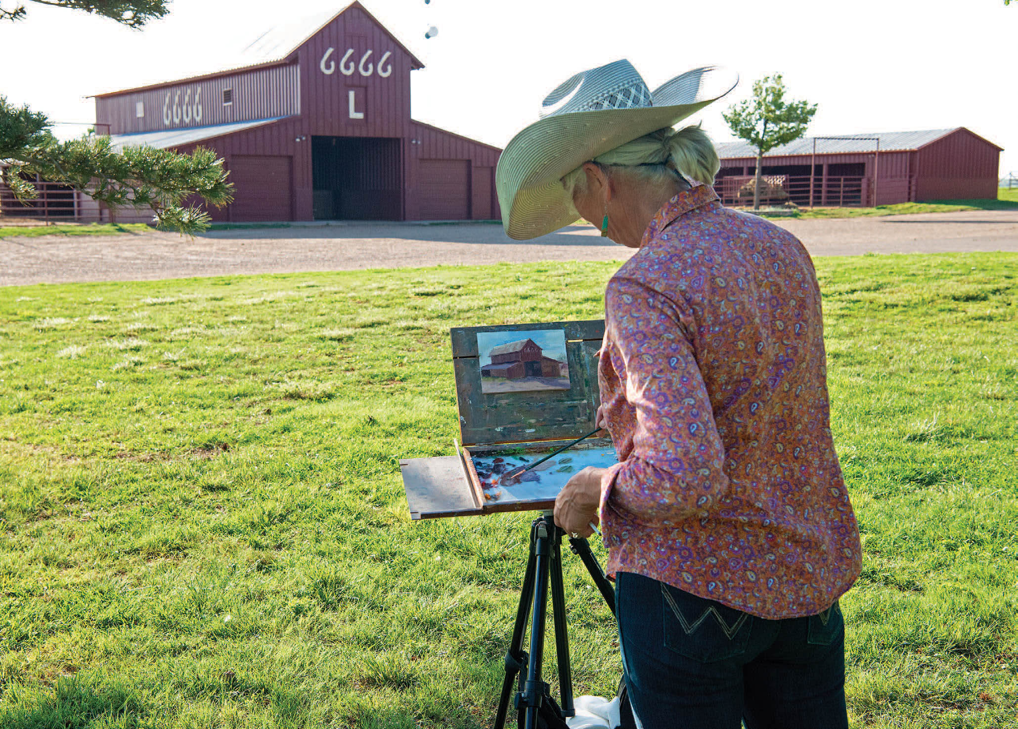 A soft breeze sweeps across the colorful landscape, rousing a fragrant aroma from the abundant wildflowers in bloom. A red pickup creaks and groans as it travels along a dirt road. Perched in the bed, three artists brace themselves and their cameras for their first glimpse at their subject: Four Sixes Ranch cowboys.