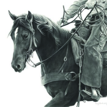 Buchholz creates intricate pencil drawings that reflect her daily life with her husband, Bob, on their ranch in Eldorado, Texas. Cameron hails from Arizona, where her family has ranched for more than 140 years. Her oil paintings—many of them featuring her husband, Dean—depict authentic scenes from her family’s ranch. Mapes, a painter and sculptor, and her husband, Jim, have ranched and raised Quarter Horses in southeastern Colorado for many years. The National Cutting Horse Association commissioned her from 2002 to 2005 to sculpt its official trophy.