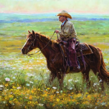 A soft breeze sweeps across the colorful landscape, rousing a fragrant aroma from the abundant wildflowers in bloom. A red pickup creaks and groans as it travels along a dirt road. Perched in the bed, three artists brace themselves and their cameras for their first glimpse at their subject: Four Sixes Ranch cowboys.